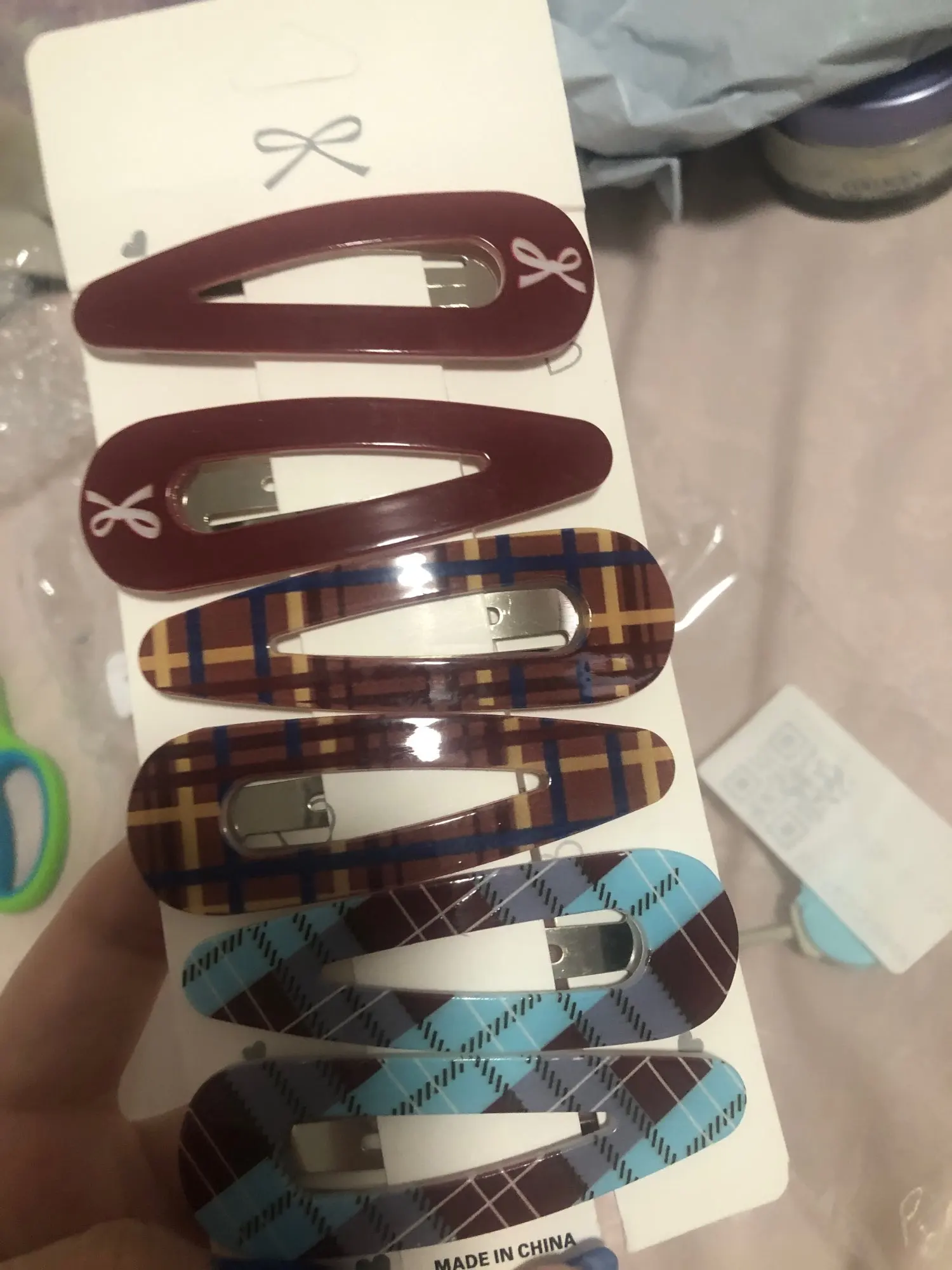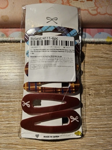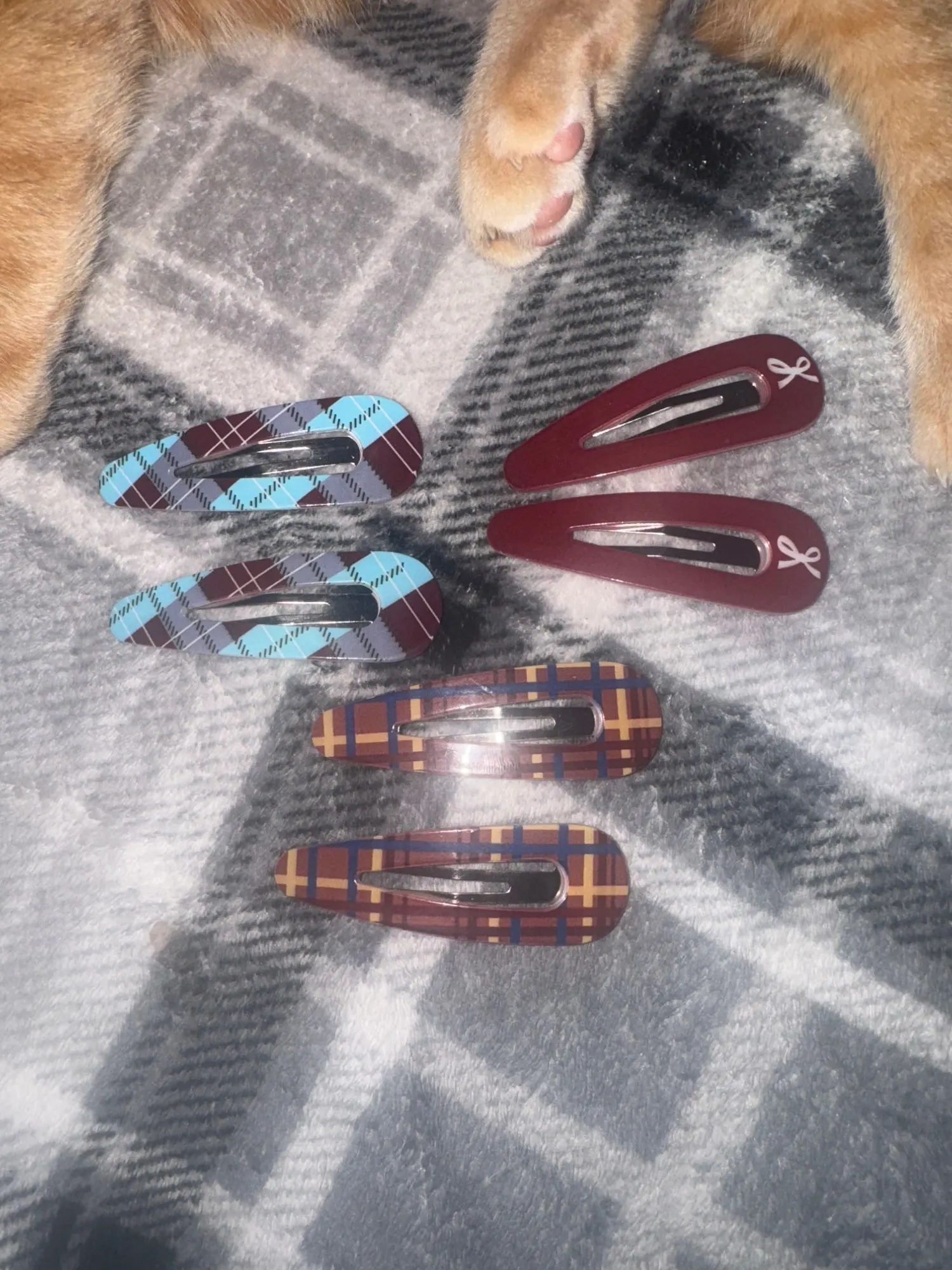 - Lot de 6 barrettes réparties en 3 duos : Bordeaux uni à nœud blanc · Tartan bleu/rouge · Tartan beige/bleu vintage