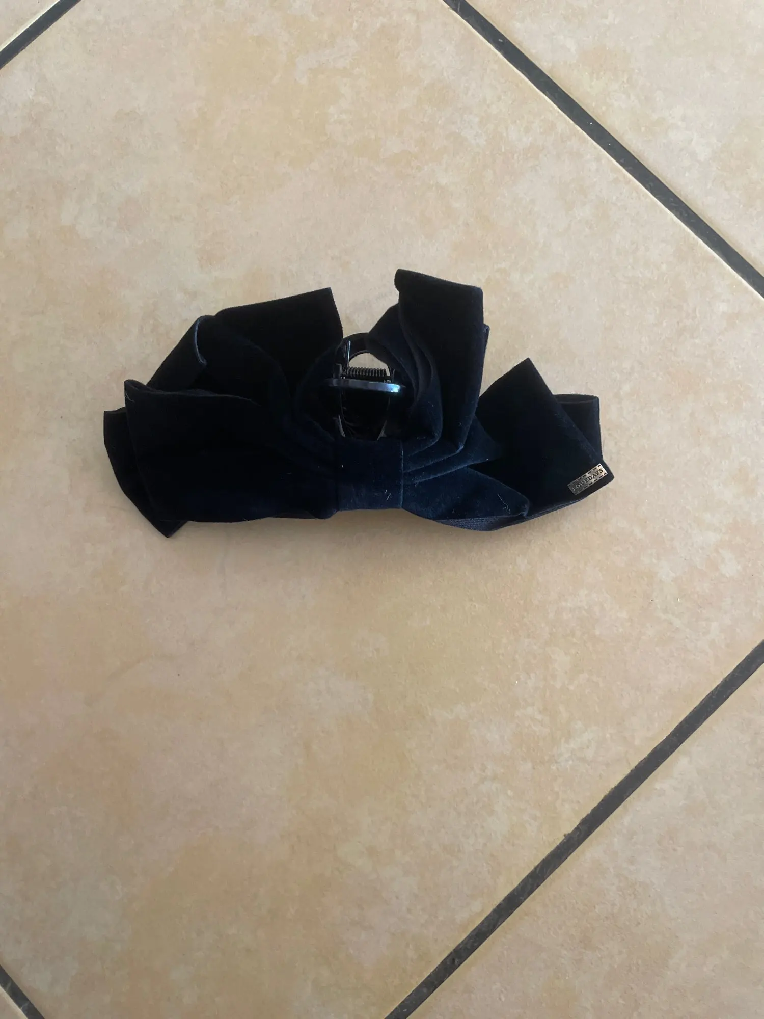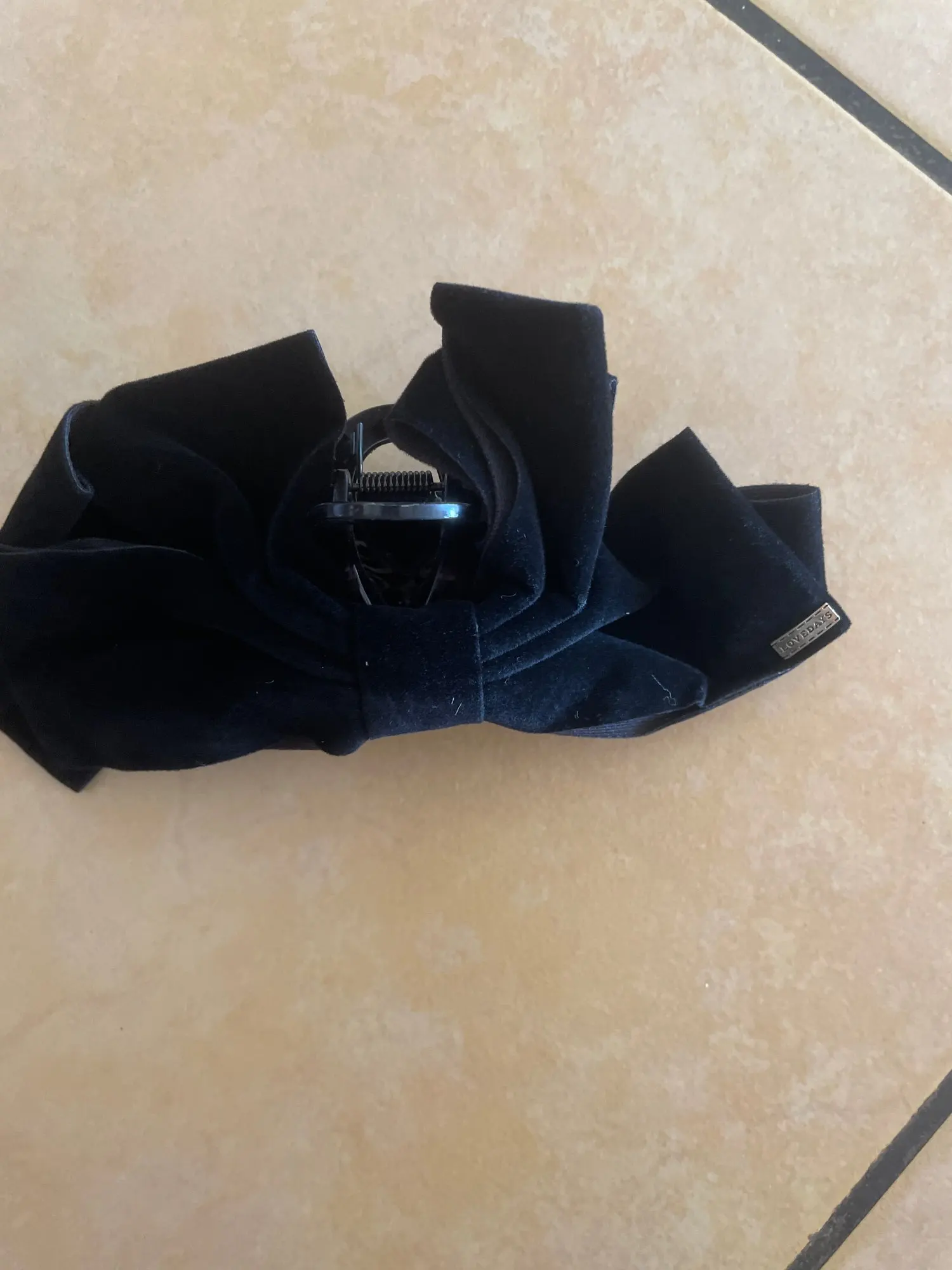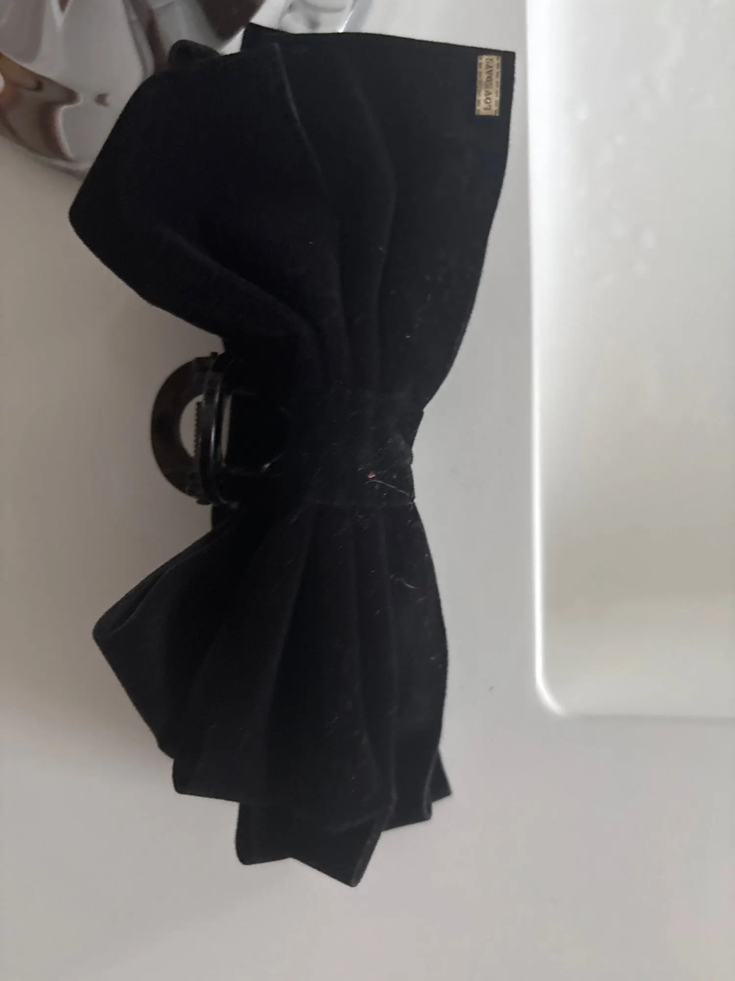 Très facile à attacher. La couleur est d’un noir profond qui lui donne un aspect haut de gamme, et le tissu n’est pas un velours bizarre, mais un vrai velours qui lui donne un aspect luxueux. La taille du ruban et de la pince est parfaite, ni trop grande ni trop petite, juste ce qu’il faut !