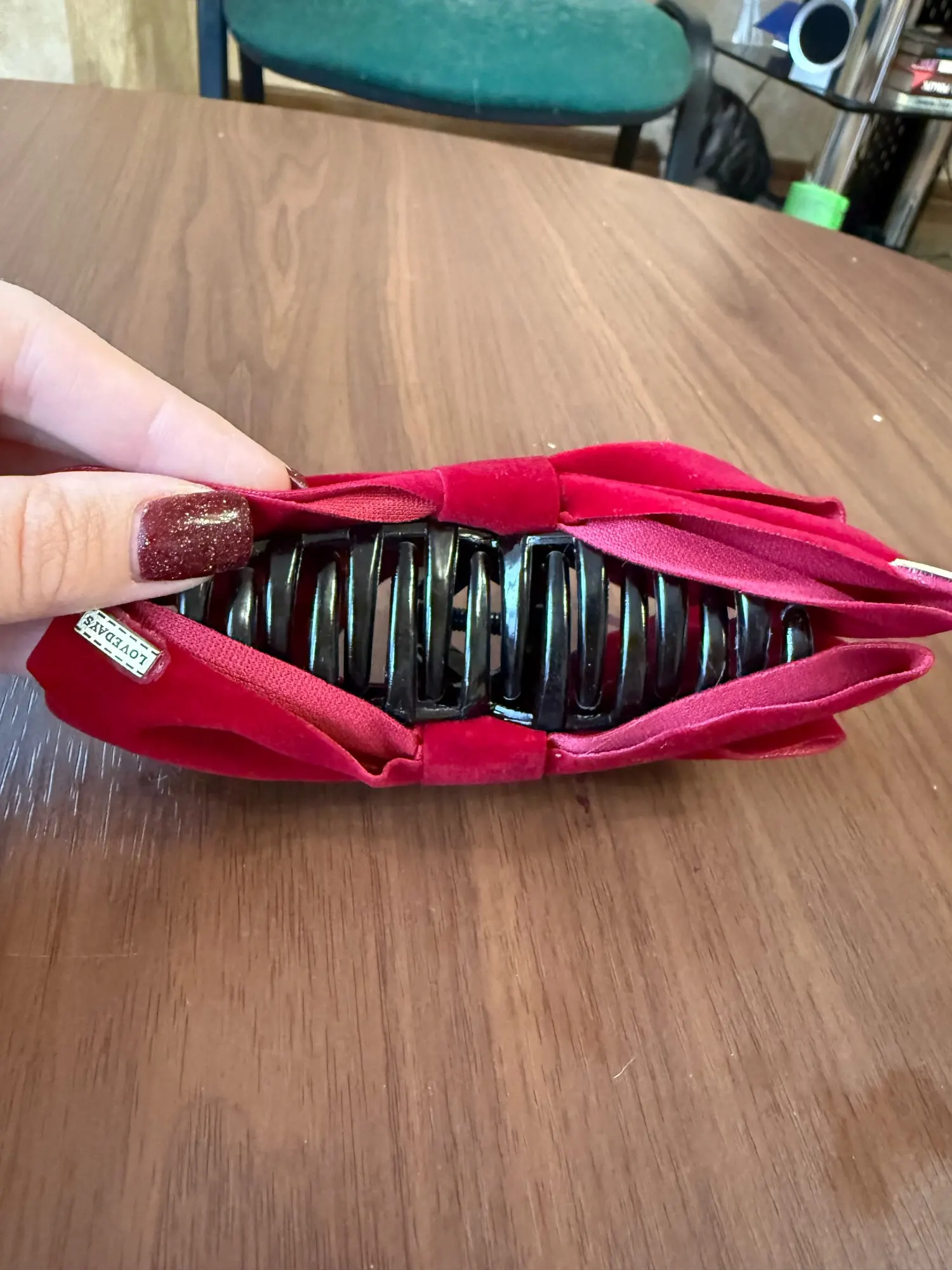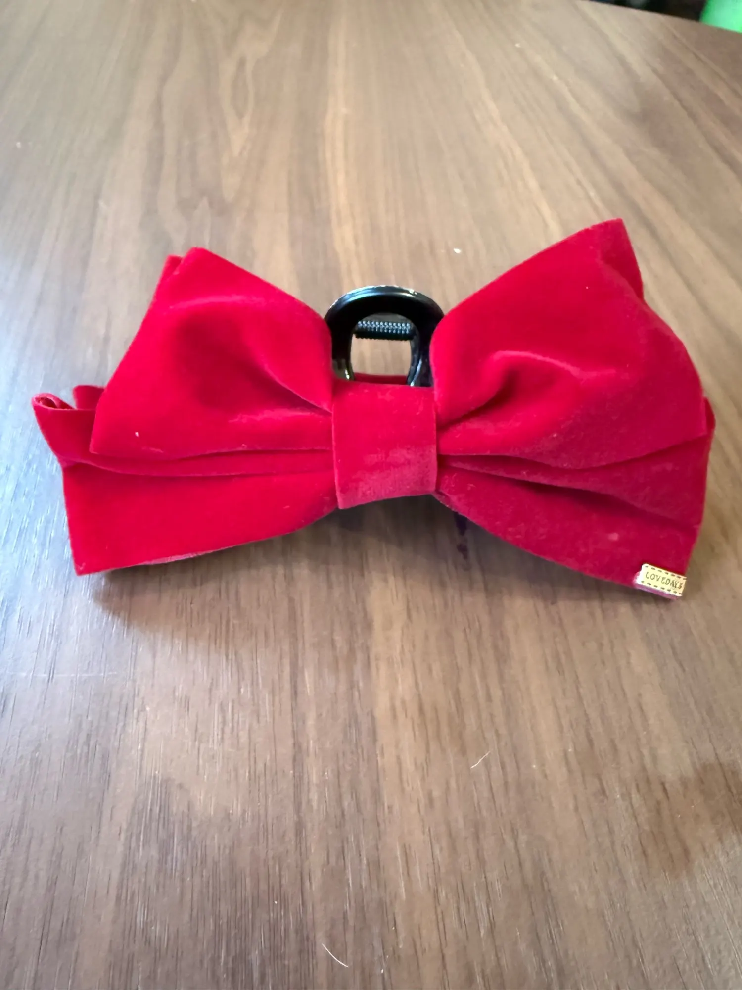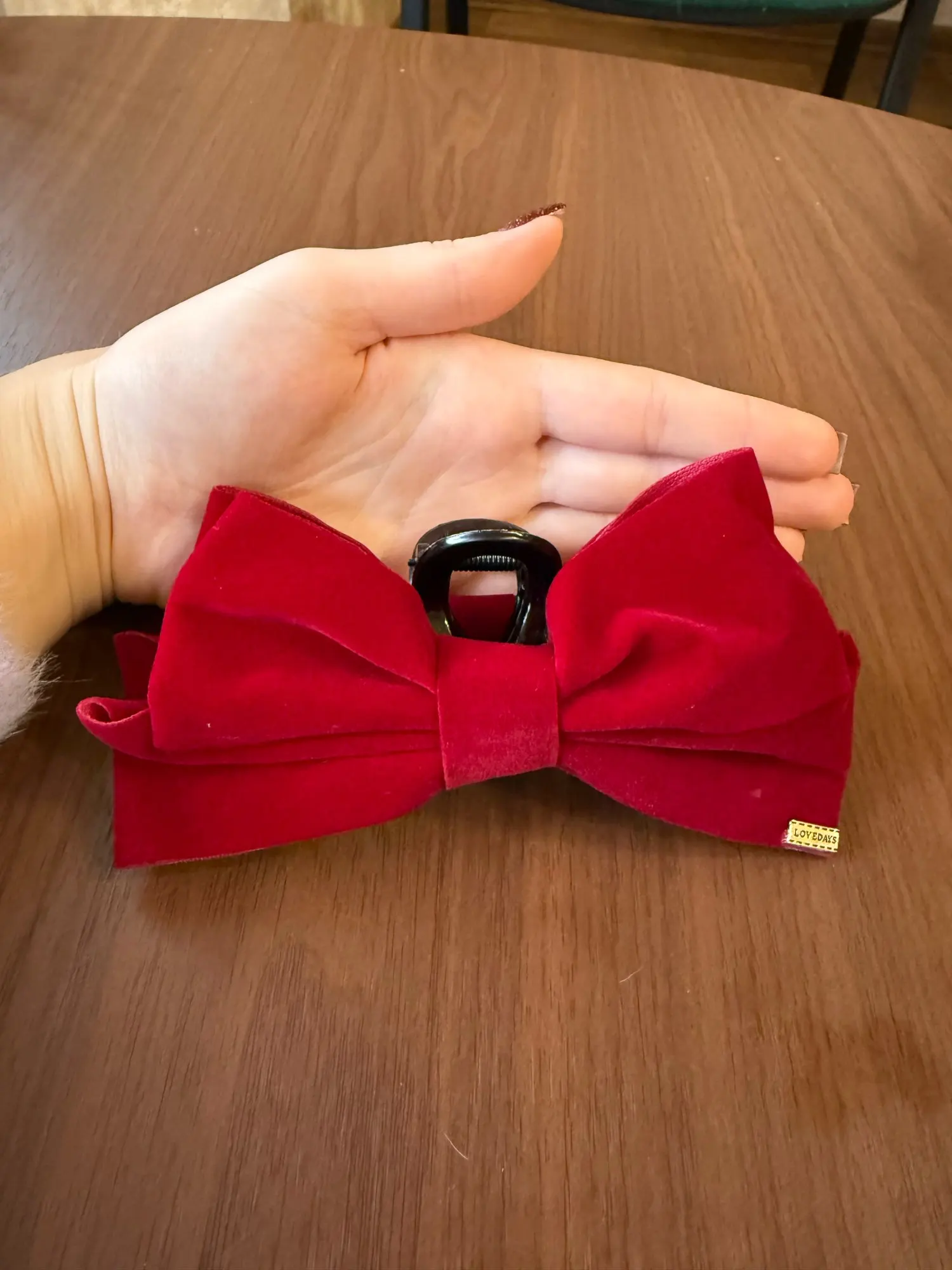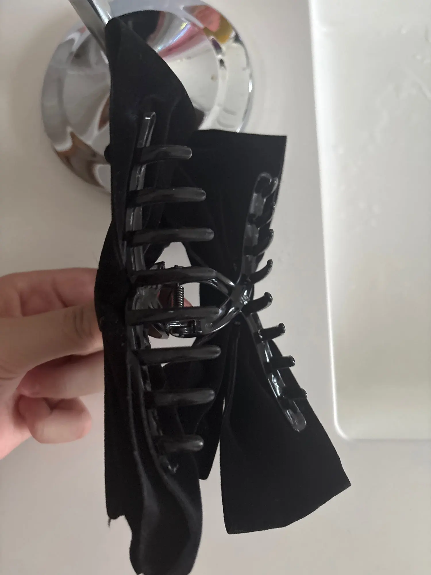 Très facile à attacher. La couleur est d’un noir profond qui lui donne un aspect haut de gamme, et le tissu n’est pas un velours bizarre, mais un vrai velours qui lui donne un aspect luxueux. La taille du ruban et de la pince est parfaite, ni trop grande ni trop petite, juste ce qu’il faut !
