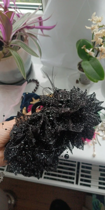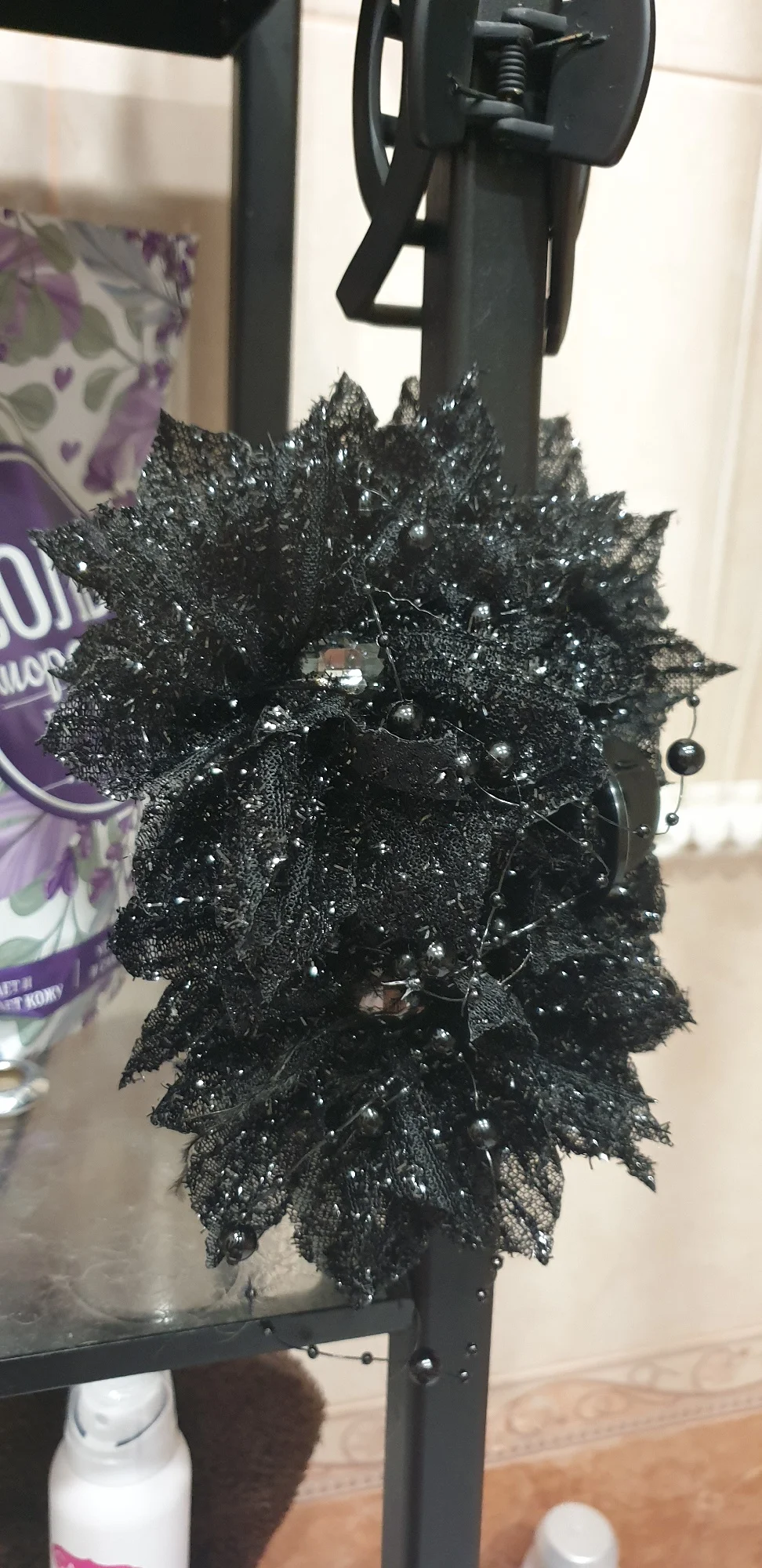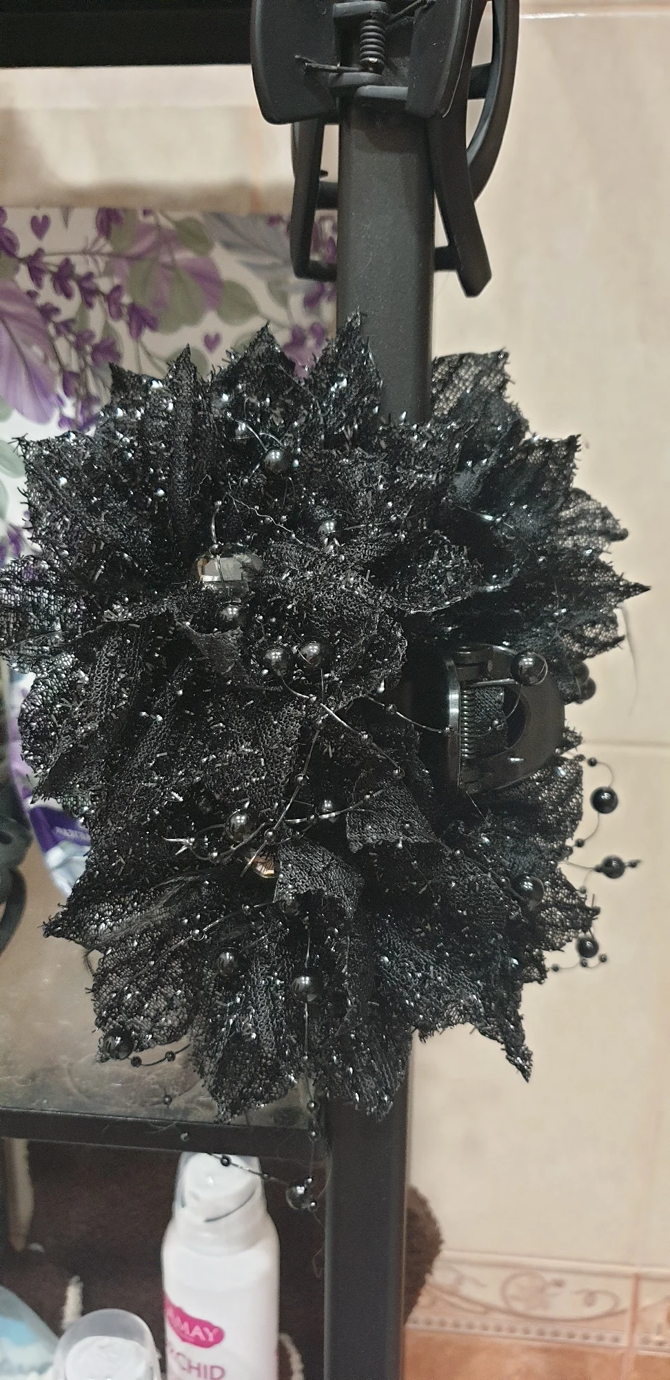Il est magnifique ! D’un noir profond (mes photos ne rendent pas justice à sa véritable couleur). La barrette est très légère et tient parfaitement les cheveux. Elle est arrivée un peu froissée, mais se défroisse facilement à la main.