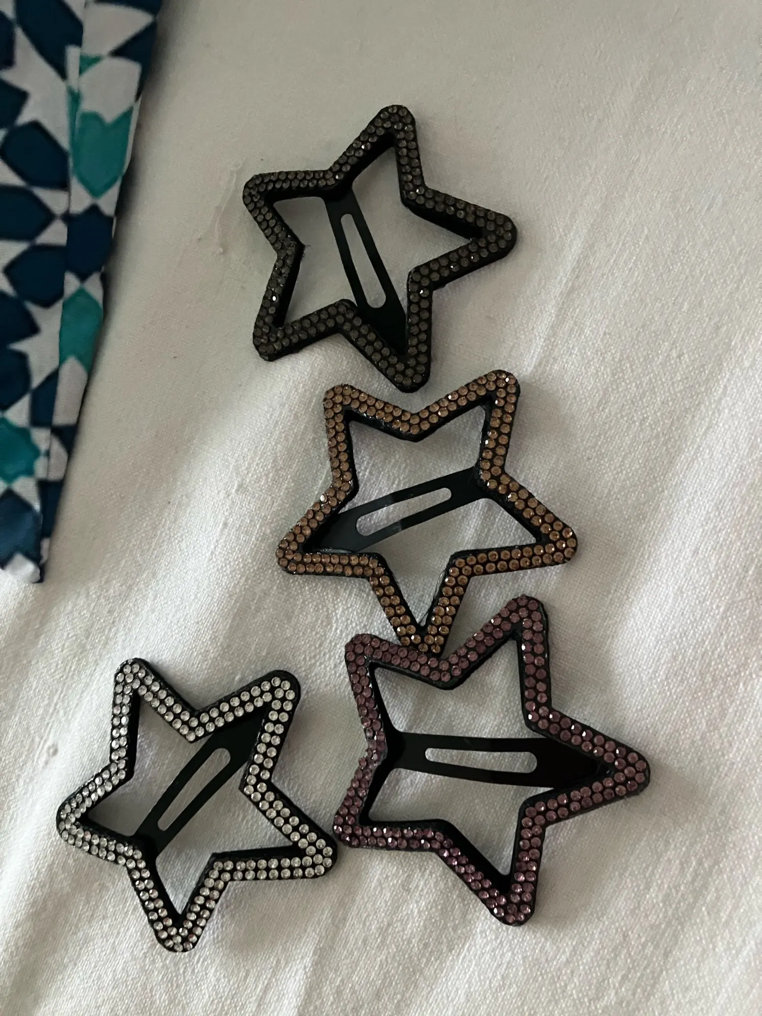 Chaque pince de ce lot est une étoile évidée dont le contour est entièrement pavé de strass — argent, or, rose, vert émeraude et gris anthracite. Des reflets différents selon la lumière, un scintillement qui capte le flash comme la lumière d’une scène.