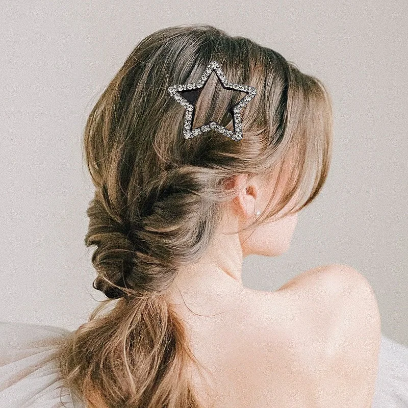 Les années 2000 avaient tout compris sur une chose : les accessoires ne devaient pas faire semblant d’être discrets. La barrette étoile strass, c’est l’héritière directe de cette époque — mais avec un niveau de finition qu’on n’avait pas forcément à l’époque. Les strass en verre remplacent les plastiques ternes d’alors, la monture métallique tient dans le temps, et la forme étoile évidée donne ce supplément de légèreté visuelle qui évite l’effet trop « chargé ». Le résultat : une pince qui assume pleinement son héritage Y2K tout en fonctionnant dans un look 2024.