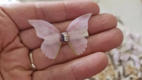 Le secret de cette barrette réside dans sa matière. Les ailes sont confectionnées en tissu semi-transparent (tulle ou organza) qui laisse passer la lumière, créant des reflets changeants et naturels.
