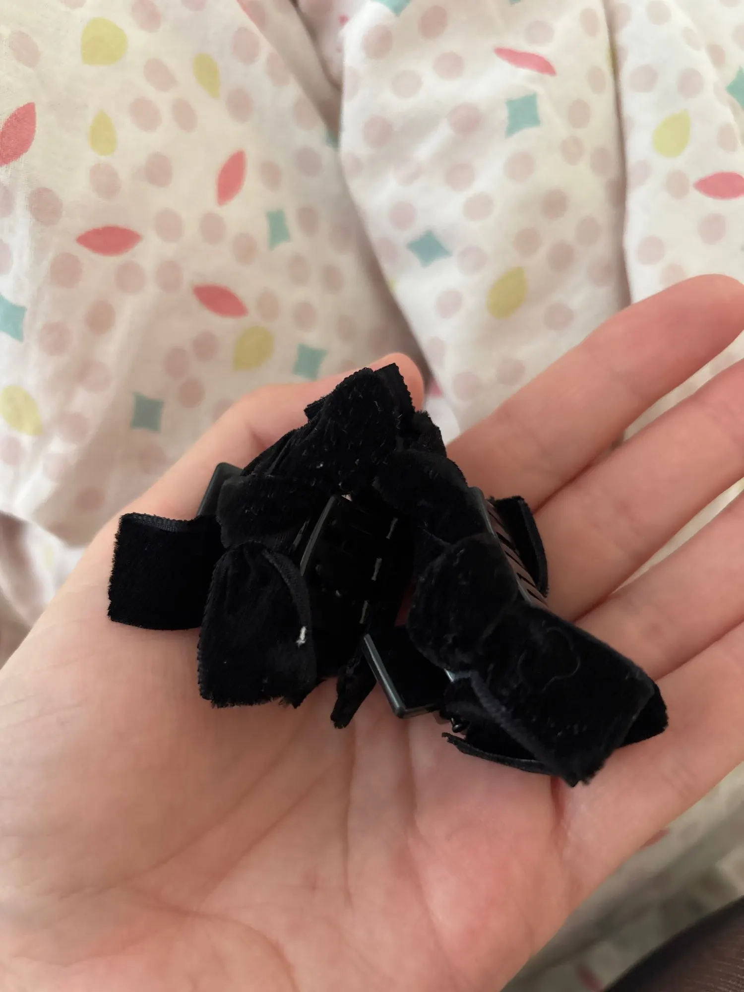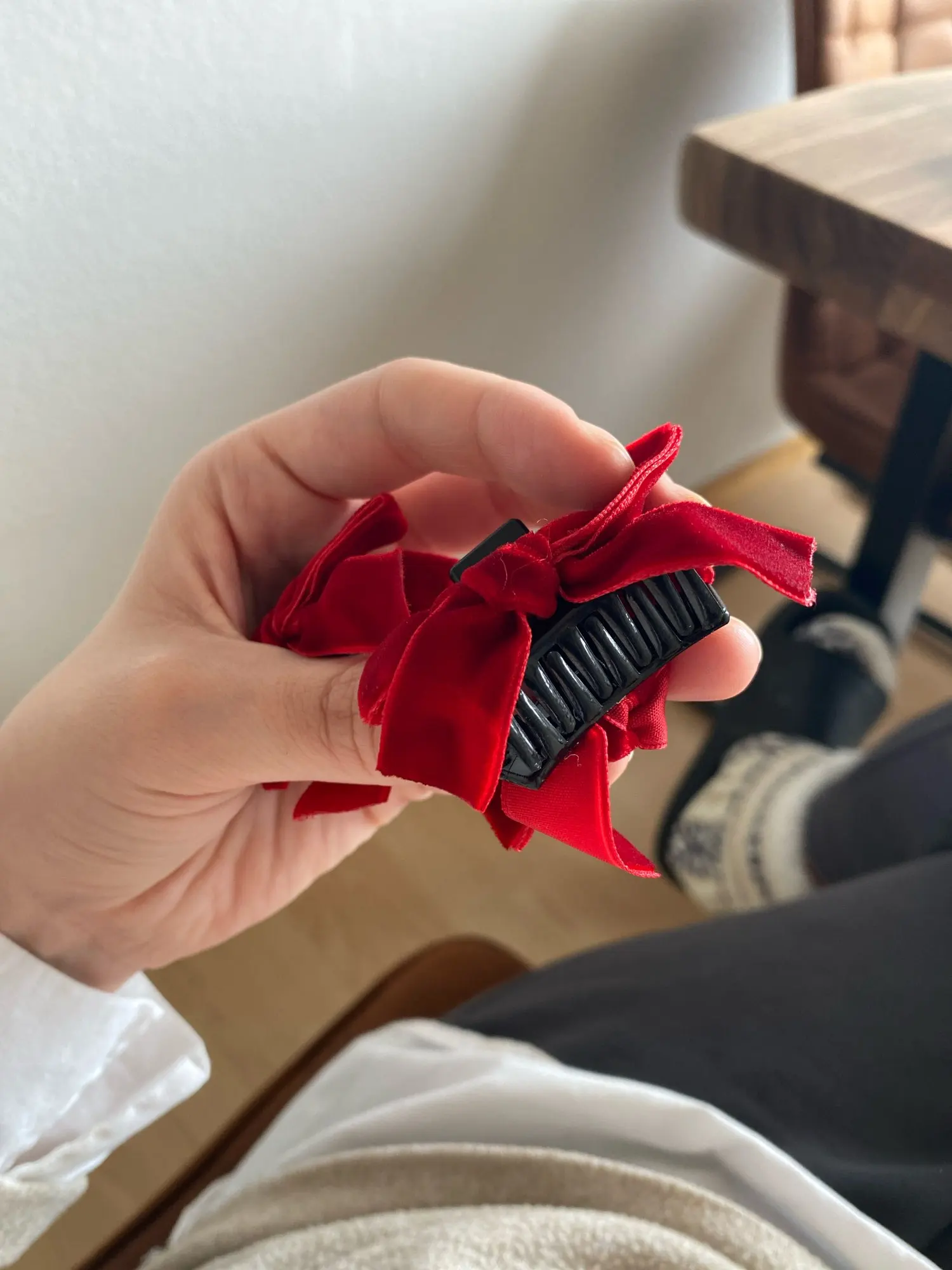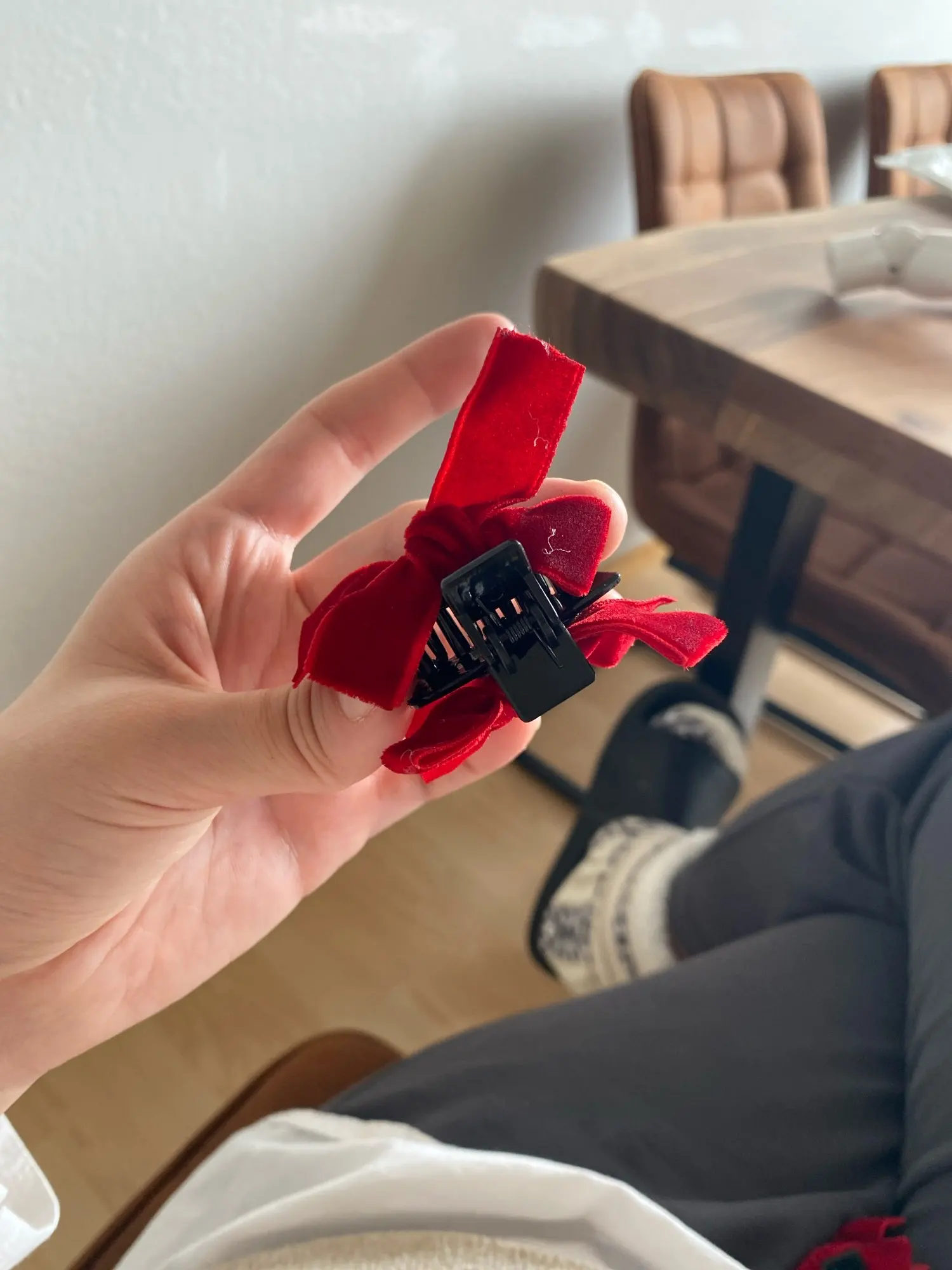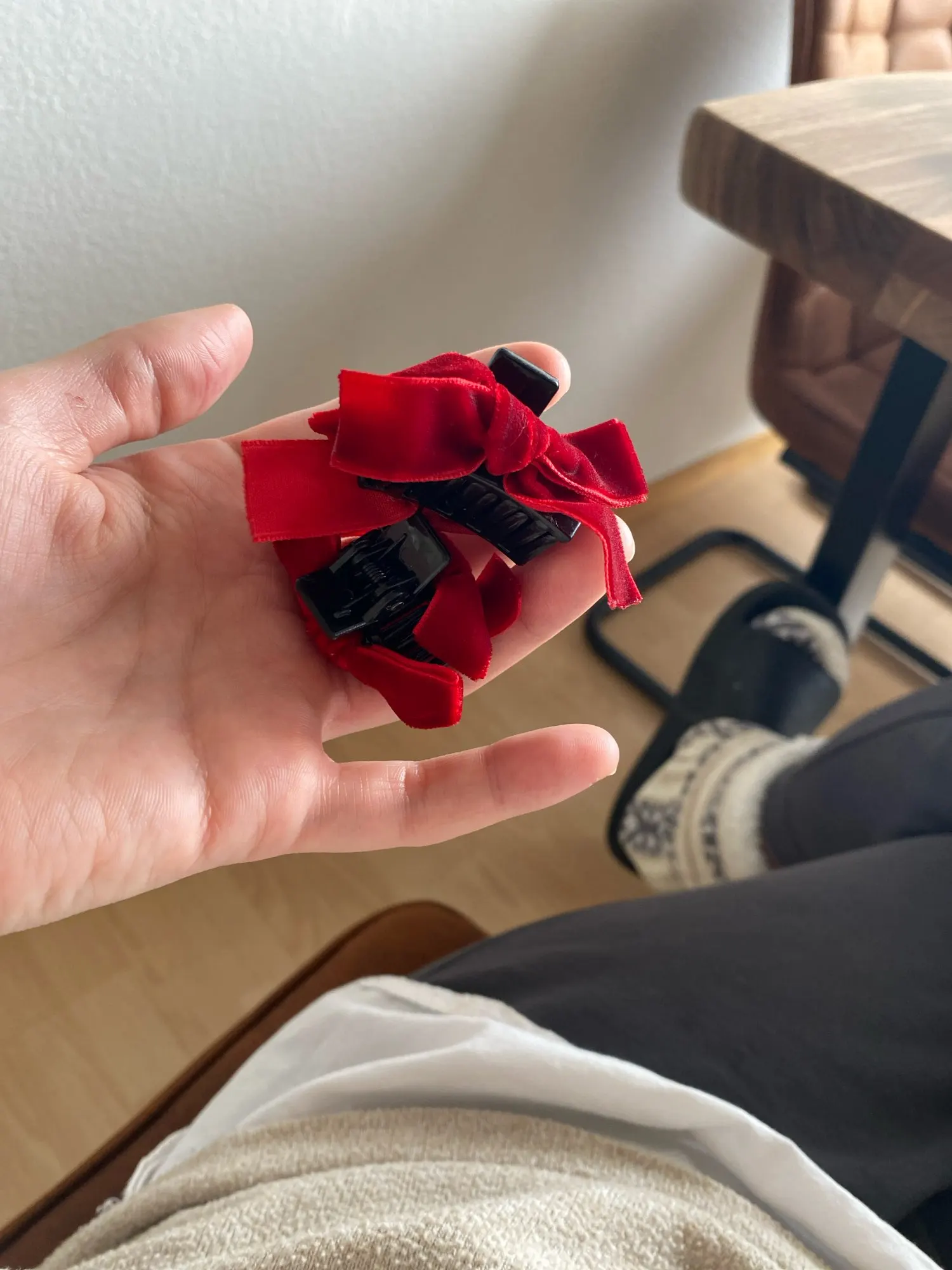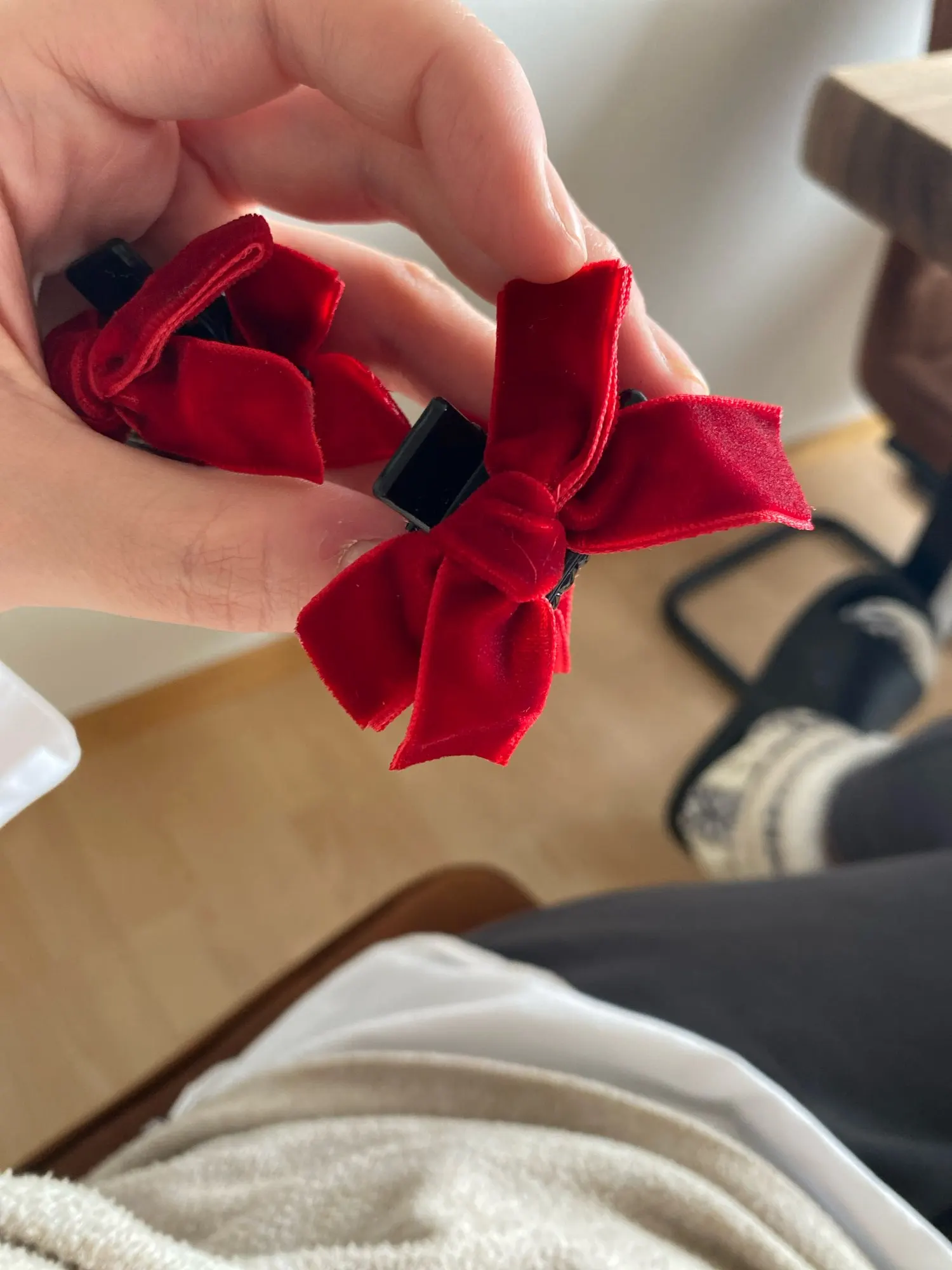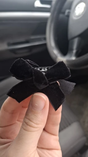 Le nœud en velours est fixé solidement sur le corps de la pince : il ne pivote pas, ne s’affaisse pas, reste centré et structuré même après une journée complète portée. Les dimensions (~3 cm) sont pensées pour ne pas peser sur les cheveux : on les oublie presque une fois posées.