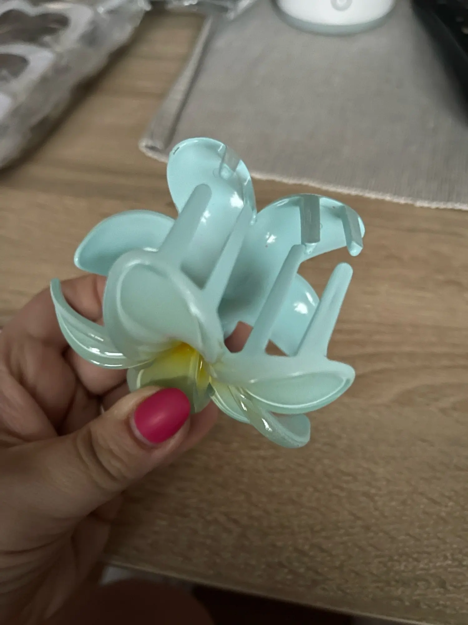 La pince est très mignonne et tient bien mes cheveux. Elle est solide et ne glisse pas. La couleur est la même que sur les photos. Très bon rapport qualité/prix. Je le recommande.