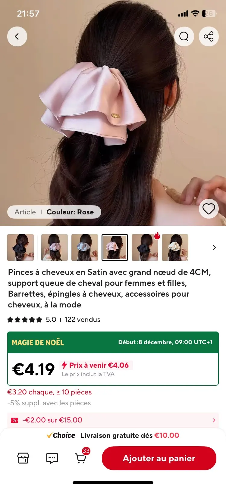 C’est un satin polyester haute densité, avec une tombée souple et un reflet irisé discret — celui qui change légèrement selon la lumière et la position du nœud dans les cheveux. Le tissu est plissé à la main sur la structure du nœud, ce qui lui donne ce volume généreux et naturel plutôt qu’un aspect rigide et symétrique.